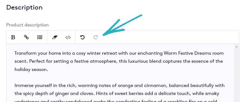 12. In the field provided, paste the description of your product. You’ll need to add some descriptive information to ensure your customers understand your product. We recommend keeping it simple and making sure you describe all of the USPs (Unique Selling Points) associated with your product. This is your main piece of sales copy, so make it as compelling as possible. Around 180 words is an optimum length. You’ll see a few formatting tools above the main field, so consider using them to make your description easy to read: