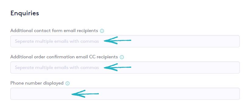 14. For each product, there is an individual enquiry form. If you want to change where enquiries for that specific product go, simply enter the relevant email addresses separated by commas. For example, use these settings if you wish enquiries about ‘the spa’ to go to your Spa Team. If you leave this blank, enquiries will go to your store’s default email address: