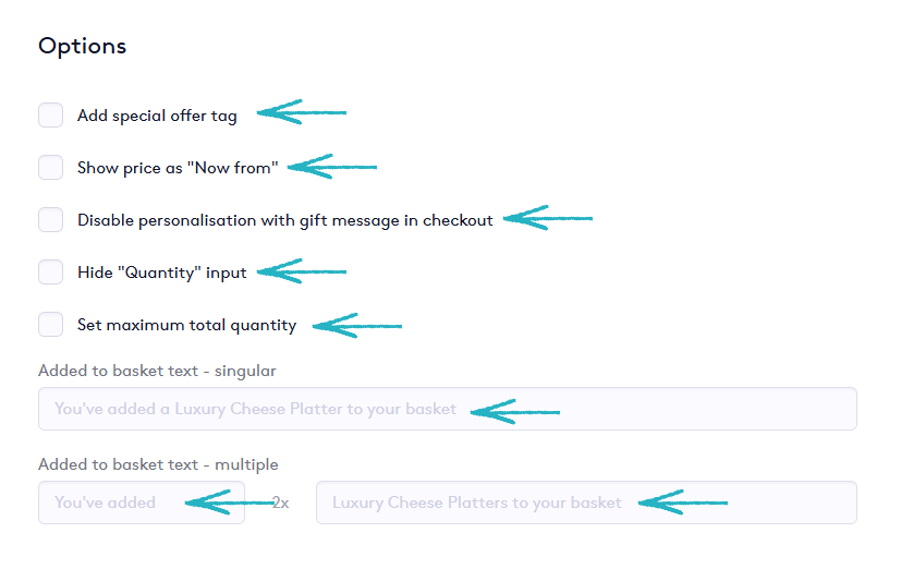 Added to Basket Text -Singular/Multiple - Here, you can see - and amend if you want - the text customers will see when adding your product to their basket.