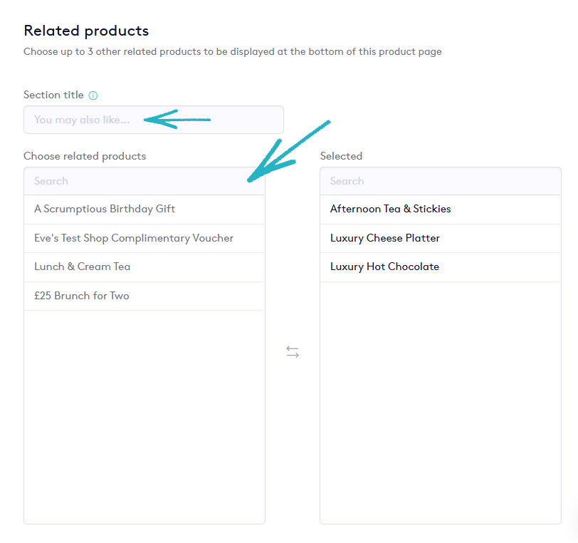 16. If your Giftpro store already has many vouchers and/or products, you’ll see the Related Products element. Although unnecessary, you can rename the Section Title by adding the relevant text to the provided field. Then you need to click on three products of your choice in the left-hand column to add them as Related Products to the product page for the item you’re currently creating: