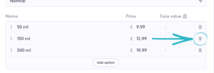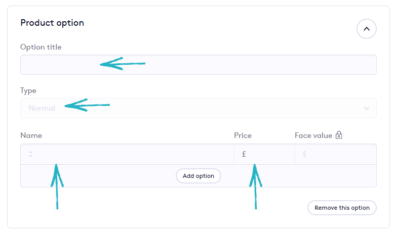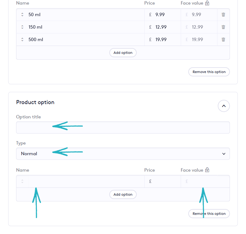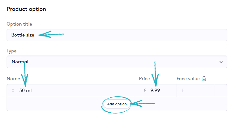 a) To add ‘Normal’ options, type the option's name and the price next to it. To add another option, click the Add Option button: