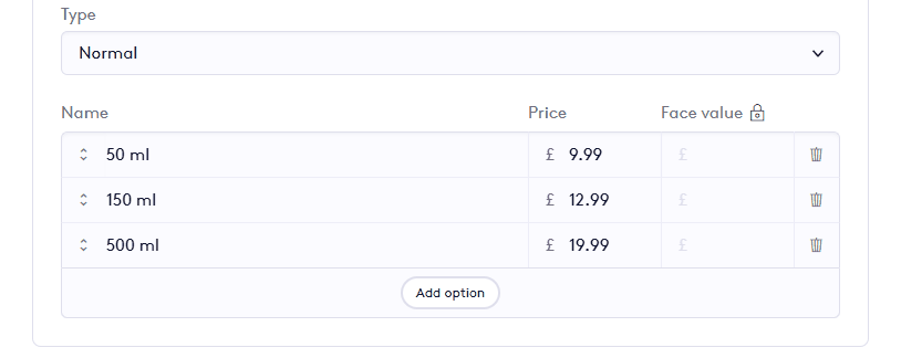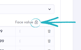 You can specify a different face value to the price the customer pays, for example, if you want to offer a product worth £150 and only charge £100. You can do this by clicking the padlock symbol next to Face Value: