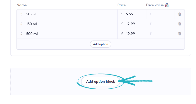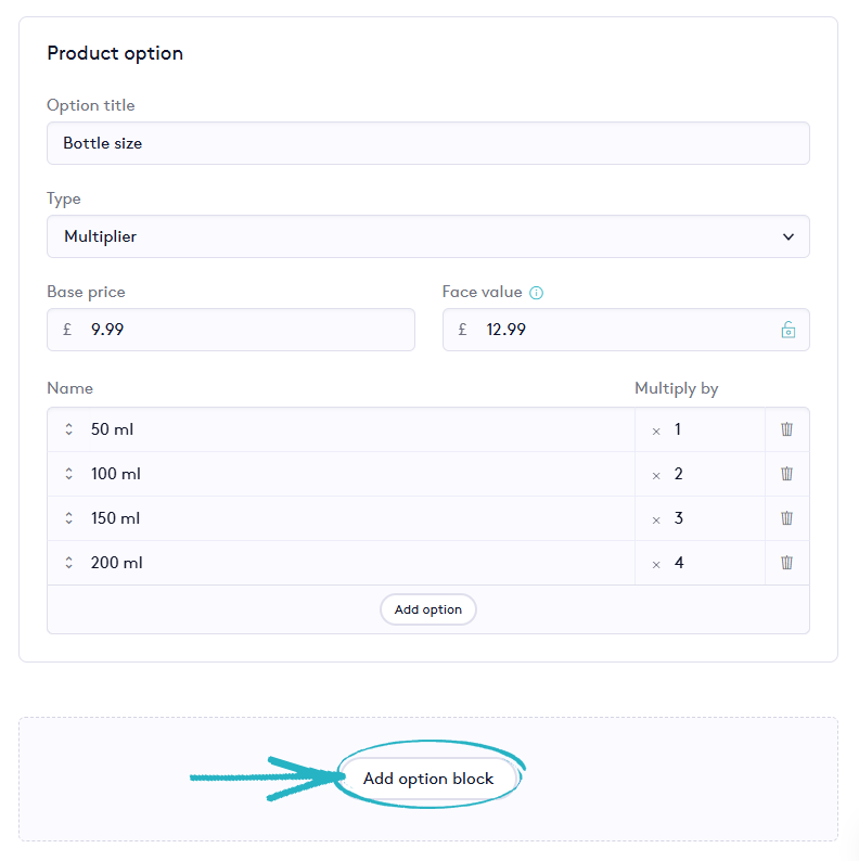 d) Should you need to offer a secondary set of options, you can do this by clicking Add Option Block below your current Product Options:
