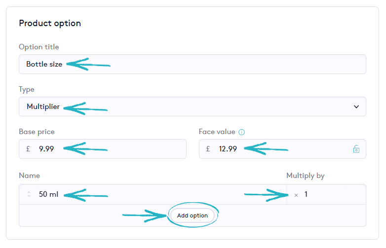 a) When you select Multiplier from the Type drop-down, You’ll see two fields appear - Base Price and Face Value. Add your Base Price and if necessary, your Face Value, and then you can begin populating your Name and Multiply By fields. Click the Add Option button to add more options: