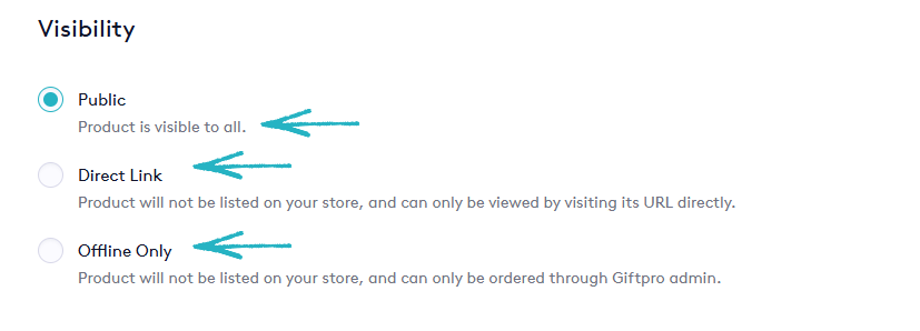 Direct Link - You will use this option if you need to send the product to a single customer, an exclusive guest list, or add it to a newsletter. Direct Link products are not visible to everyone, or displayed on your Giftpro store.