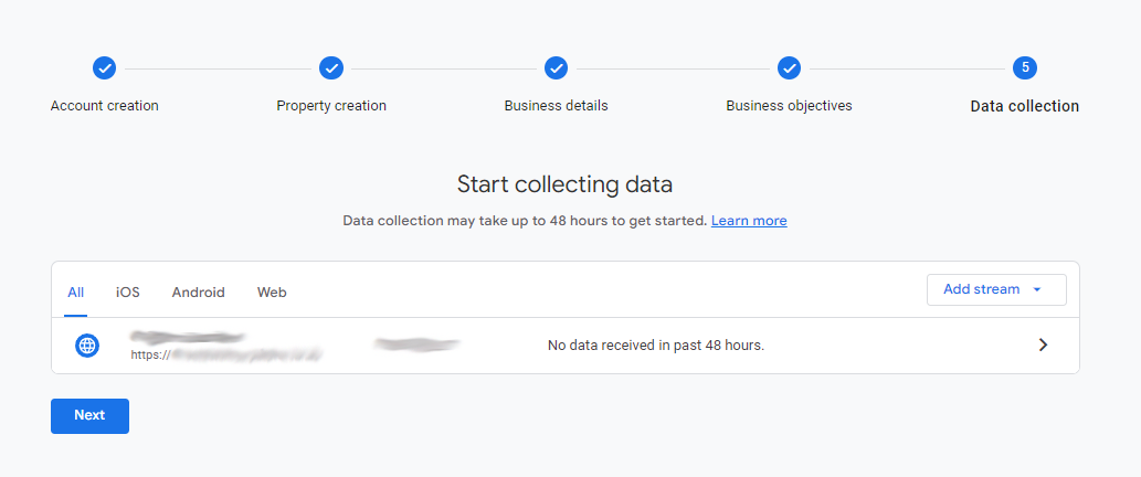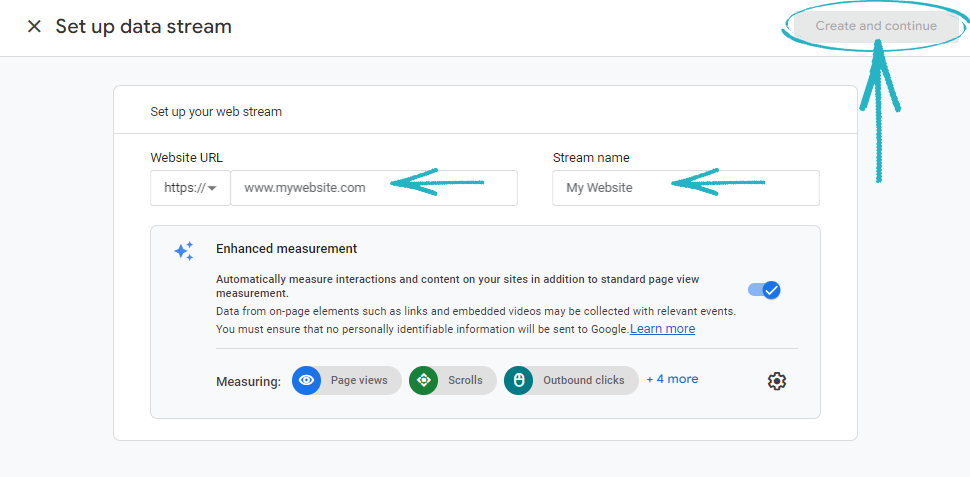 11. Paste the URL of your Giftpro store in the Website URL field, and add the name of your Giftpro store in the Stream Name field before clicking the Create And Continue button in the top right-hand corner:
