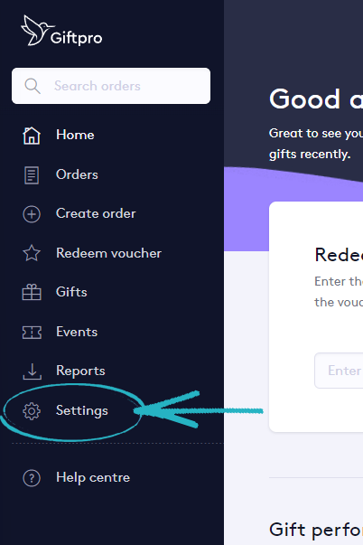 16. Using a separate browser tab, log into your Giftpro store and click Settings on the left-hand side: