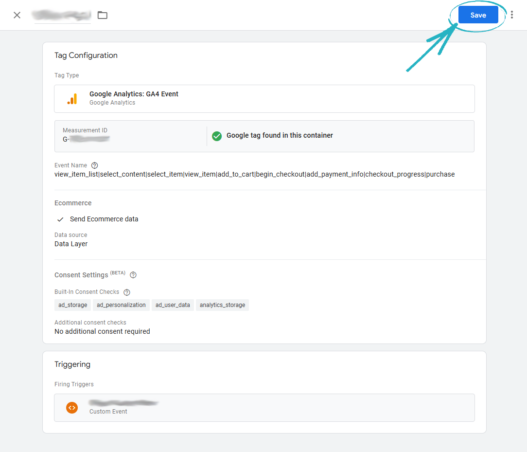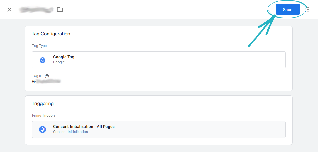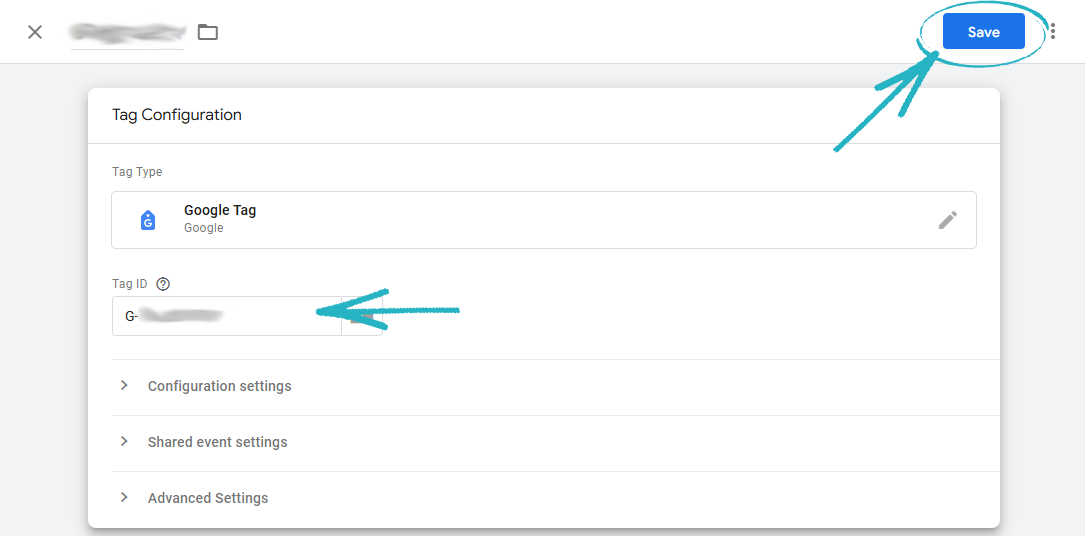 44. Paste the Measurement ID into the field provided, and then click the Save button in the top right-hand corner: