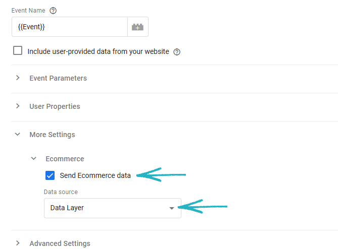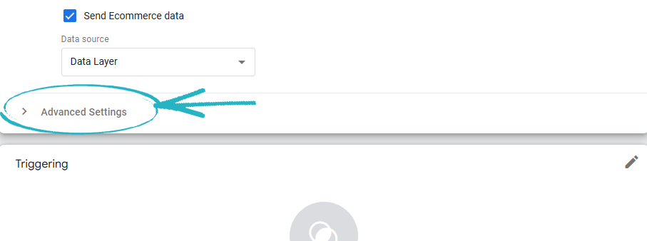 56. Tick the box to Send Ecommerce Data, and ensure that Data Layer is selected in the drop-down menu: