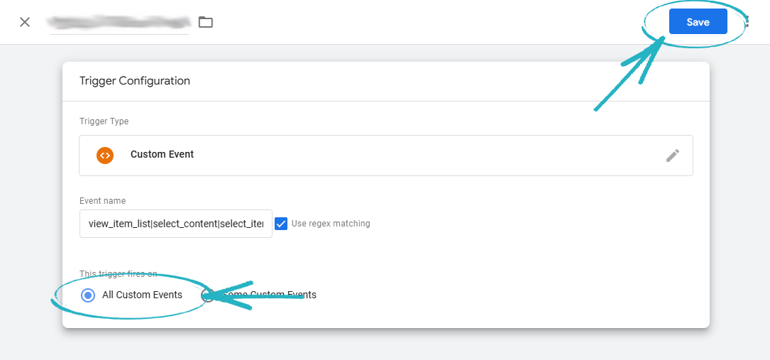64. Paste the text into the Event Name field, tick the box to Use Regex Matching and ensure that the box for All Custom Events is checked before clicking Save in the top right-hand corner:
