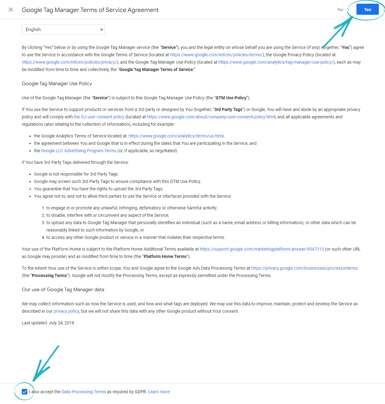 35. A menu of terms will appear. Tick the box at the bottom and then the blue Yes button in the top right-hand corner: