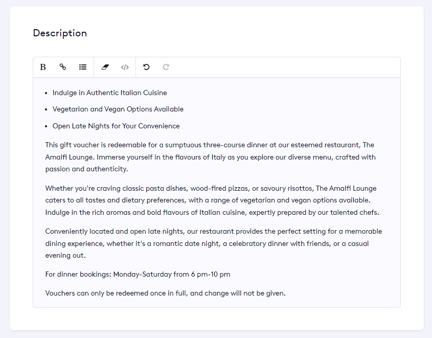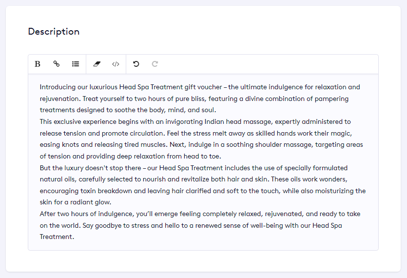 A good description usually consists of features or USPs (Unique Selling Propositions) - these can be traits exclusive to the gift voucher and a body of text. Still, sometimes, just a strong body of text is effective enough. Usually, bullet-pointed features list all the unique features so a customer can determine them at a glance. The text, however, gives the customer reasons to buy the gift voucher. You need to tell them why they need the gift voucher, how it can be used and what it is compatible with. If you can, reduce ‘buyer’s guilt’ too by detailing the potential usability and longevity the customer can expect from the gift voucher.