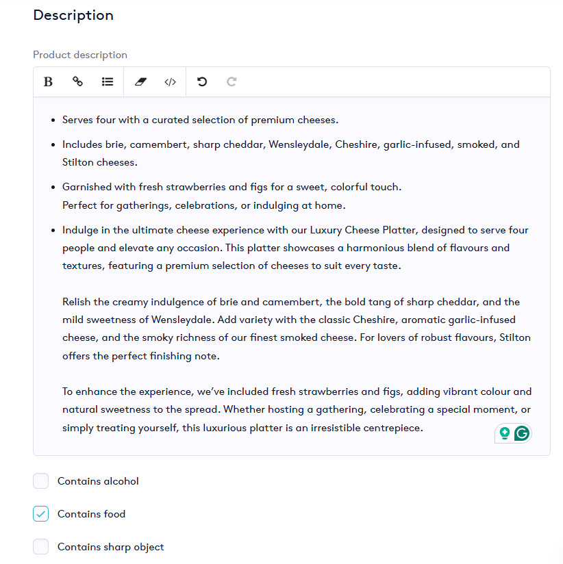 Descriptions are essential and invaluable for SEO (search engine optimisation) and customer experience. It’s lovely having beautiful, eye-catching images, but without further information in the form of a good description, customers are unlikely to purchase without knowing all the finer details. Descriptions are the equivalent of a written image (which is fundamental for visually impaired customers - a description is what they depend on while choosing whether to purchase).